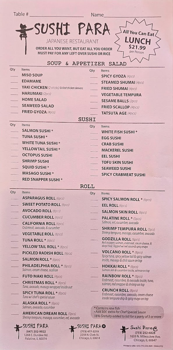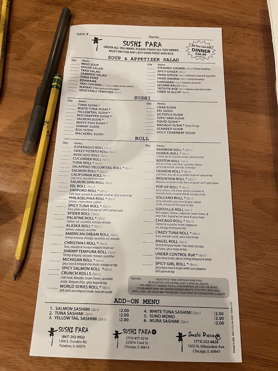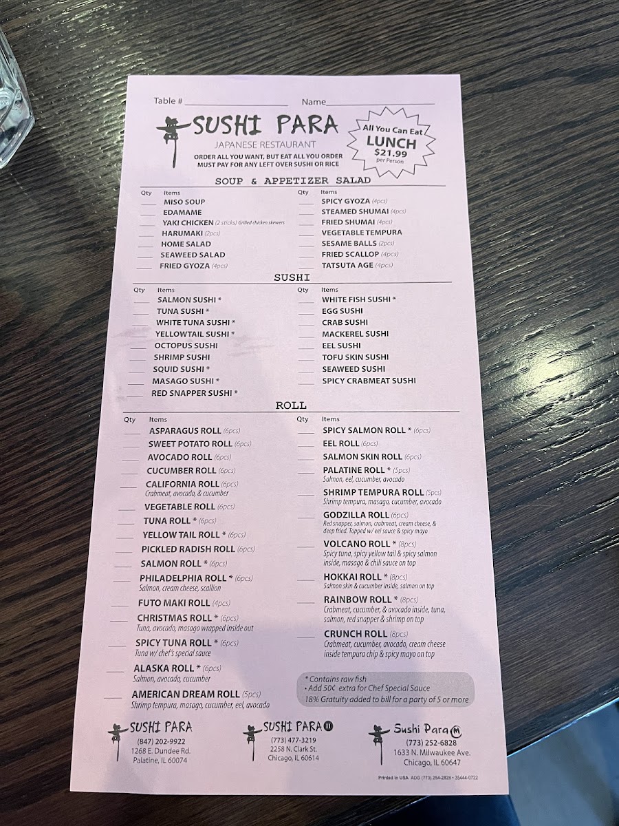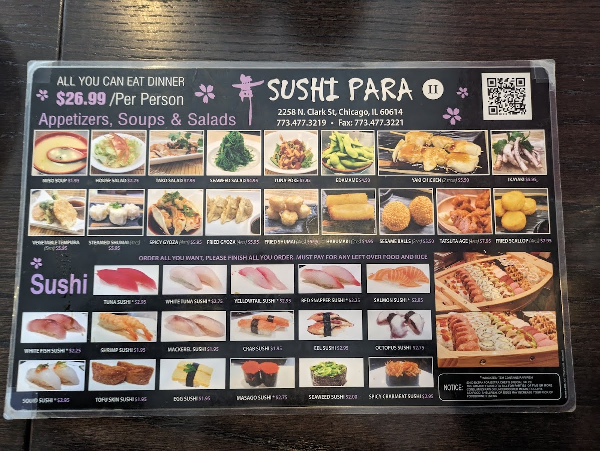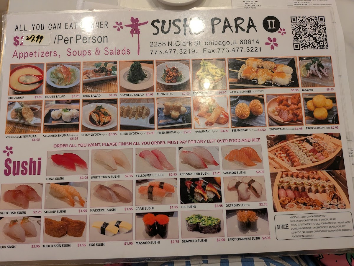 Welcome to Sushi Para II, an exquisite sushi haven nestled in the vibrant Lincoln Park neighborhood of Chicago. Located at 2258 N Clark St, this restaurant is more than just a sushi spot; it's an experience that encapsulates the artistry of Japanese cuisine. Known for its impressive all-you-can-eat (AYCE) menu, Sushi Para II offers an enlightening journey through a delicious world of flavors, carefully prepared with the freshest ingredients.